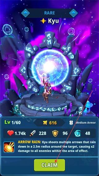 你通过召唤获得了稀有品质(RARE)的英雄Kyu,该英雄掌握技能ARROWRAIN。请点击界面上的CLAIM按钮,即可领取这位英雄。
