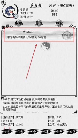 学习新【功法】需积累【1000修为】与【50财富】,满足条件后可解锁新能力,提升修炼效率,助力境界突破。