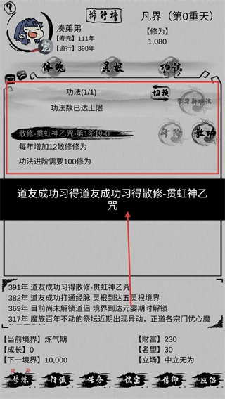 已修习【散修-贯虹神乙咒-第1阶段-0】,此功法每年可增加12点修为;若要进阶功法,需积累100点修为,进阶后能提升后续的修炼速度。