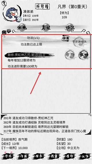 当前功法若要进阶,需消耗【100修为】,达成条件后点击进阶按钮,即可提升功法等级,进而增加每年的修为获取量,为后续修炼提供助力。