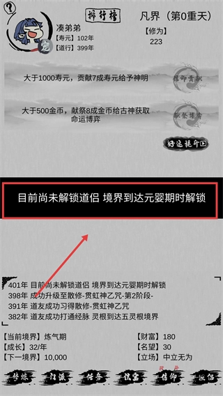 道侣系统尚未解锁,需将境界提升至【元婴期】,达成后即可解锁道侣功能,进而拓展修炼相关玩法。