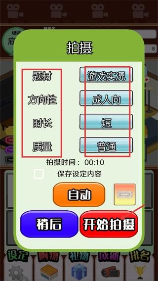 在【拍摄】页面选择【题材-游戏实况】【方向性-成人向】【时长-短】【质量-普通】,确认各项设置无误后,点击【开始拍摄】按钮即可启动录制流程。