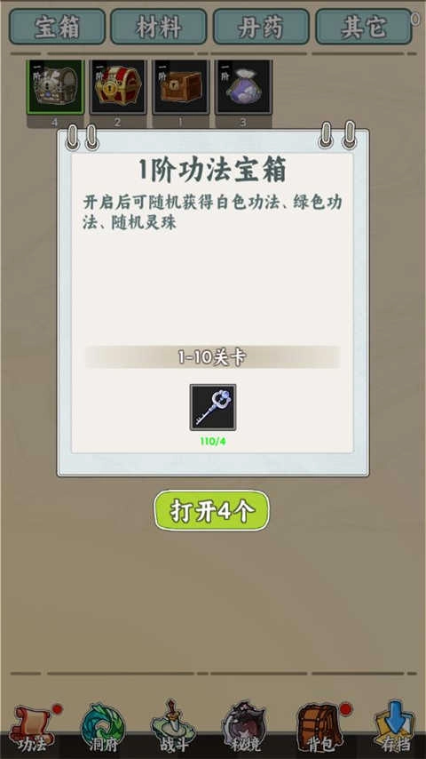 通过开启获得的宝箱奖励,获取各类功法技能,以此提升自身的战斗力与修仙能力。