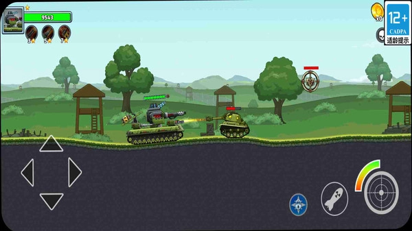 1、借助虚拟摇杆来操控坦克的移动方向,点击屏幕上的主炮按钮可发射主炮,点击机枪按钮则能进行机枪扫射;