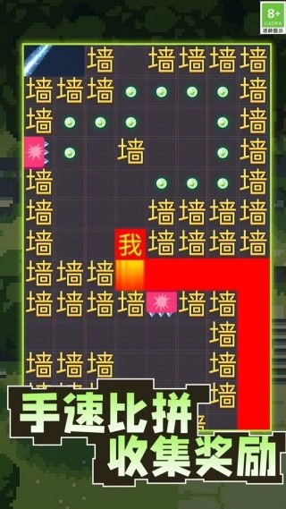 1、操作和策略的关联性很强,虽然是用滑动手指的方式来控制方块移动,但需要提前规划好行进路线以避开“墙”的阻挡,同时还要快速做出反应来躲避突如其来的危险。