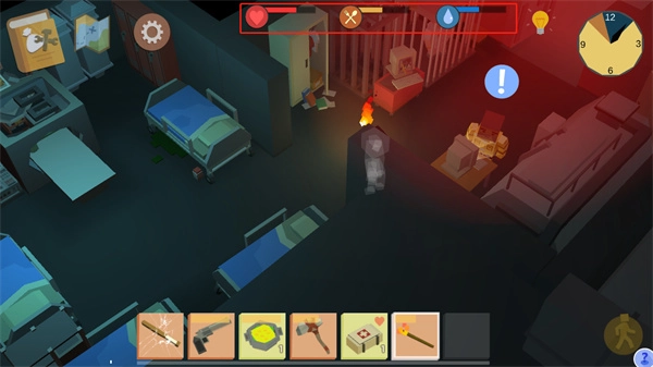 10、玩家在游戏过程中还需留意界面上方的血条、饱食度与水分值。一旦饱食度或水分耗尽,便会持续扣除血量;若血条归零,游戏则需重新开始。