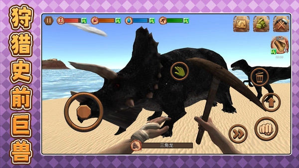 1、多元化狩猎:拥有弓箭、长矛、陷阱等各类原始武器,可针对不同恐龙规划专属的狩猎策略。