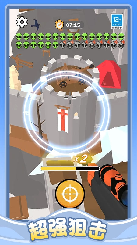 2、点击屏幕就能完成射击,只要命中了外星人就能推进关卡进度,部分关卡要留意得命中要害,防止惊动目标让挑战难度变大。