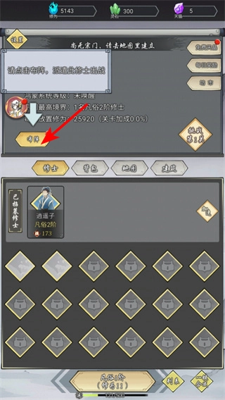 1、在宗门界面,点击上阵按钮即可进入修士配置界面,这是调整宗门战力与资源产出的核心操作,后续还能通过配置不同修士来优化宗门效率。