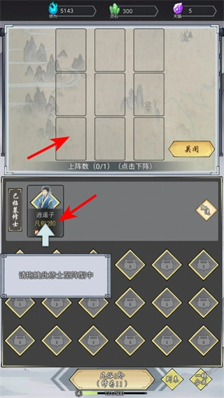 2、进入上阵界面后,把已招募的修士(比如浊莲子)拖动到阵位的空格中,就能完成修士的上阵安排。安排好之后,修士会参与宗门的资源生产,助力提升属性。