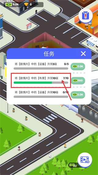 1、进入【任务】界面查看,了解到【剧情片】板块里的【布景】升级目标是10级,目前进度为7/10,完成此任务能够得到【500】的奖励。