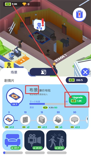 3、进入【剧情片】的场景界面,找到【布景】模块,点击【Upgrade】按钮消耗资源,提升【布景】的等级以推进任务。