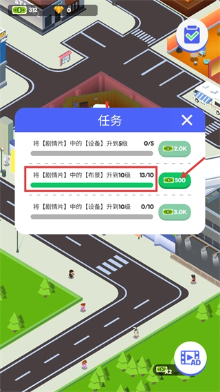 4、升级操作完成后,回到【任务】界面,检查【剧情片】分类下的【布景】升级任务是否已达成(当前进度显示为13/10),确认无误后点击领取相应的【500】奖励。