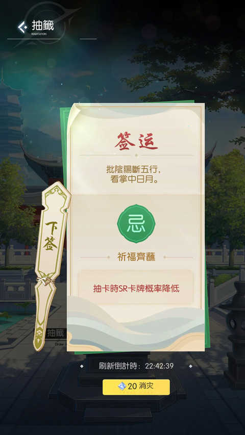 抽签不知道能不能刷出SSR概率上升的情况(应该是可以的,毕竟存在SR概率下降的设定,那下下签大概率也会有SSR概率下降的机制)。
