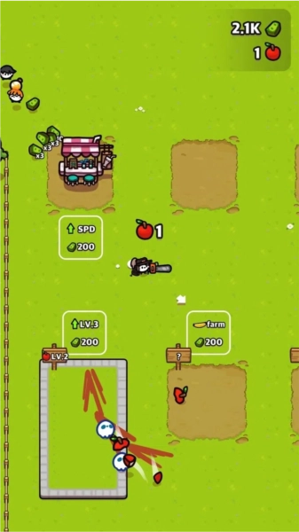 3、操作优化设计:将电锯切割的操作简化为滑动触控,并借助震动反馈来强化劈砍水果时的畅快操作感受。