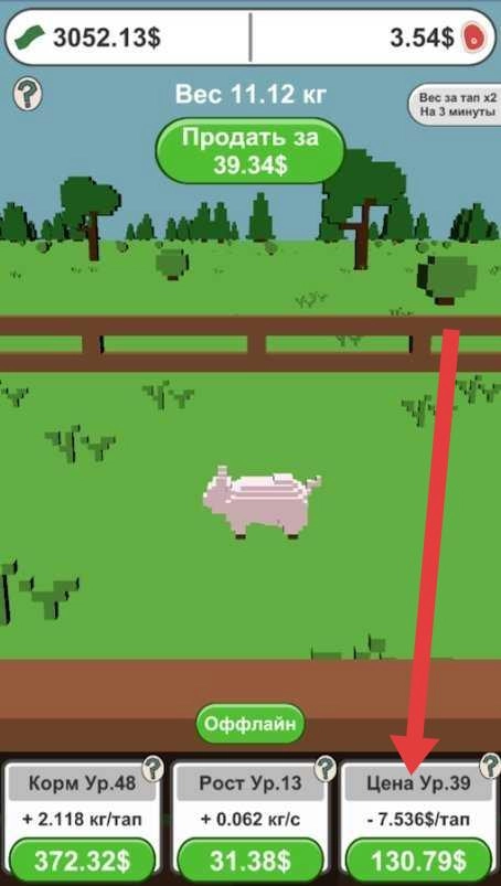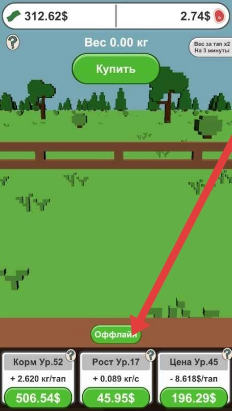2、猪只售出后,点击【Оффлайн】(离线)按钮,就能领取离线收益,把这笔资金积累起来可用于下次养殖。