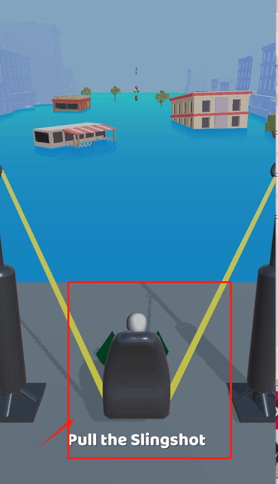 1、点击拉动弹弓的按钮,通过蓄力将人物发射出去,使其飞向被洪水淹没的城市上空。