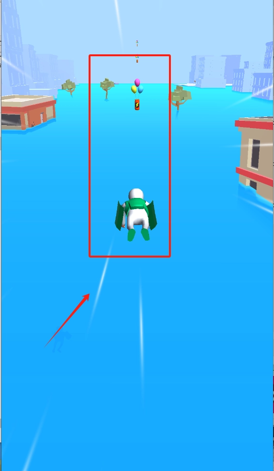 2、控制绿翅膀角色在空中飞行,收集红色框里的彩色气球与道具物品。
