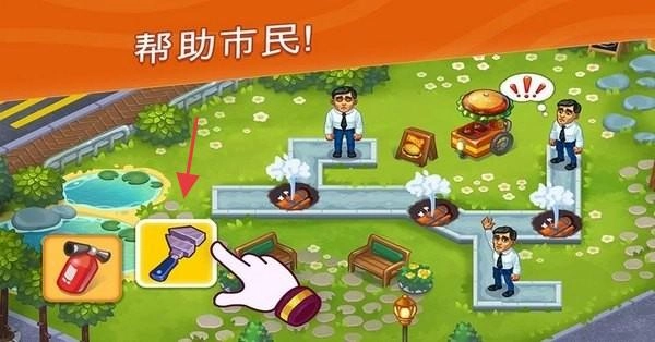 1、在“帮助市民”这一关卡中,选择工具(红箭头标识),对道路设施进行修复,从而解救被困的市民。