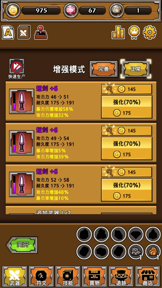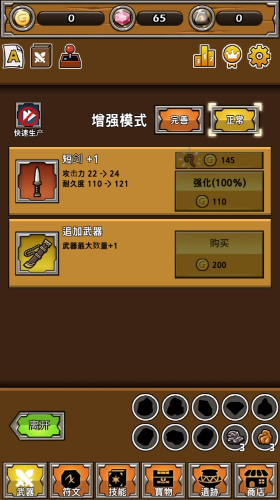 2、有了矿石之后就可以锻造名剑,还能用金币升级。