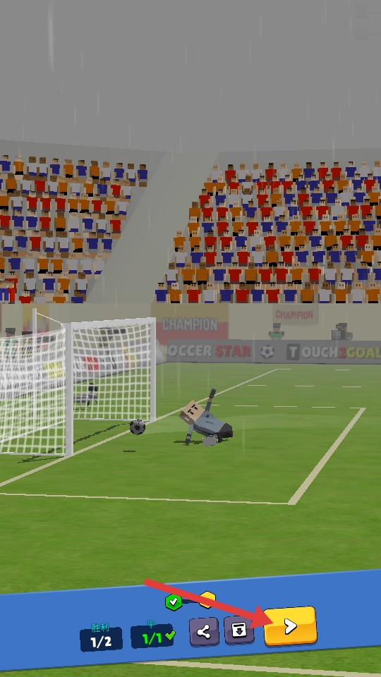 4、进球获胜后,点击右下角的黄色箭头按钮,即可继续进行下一场比赛。