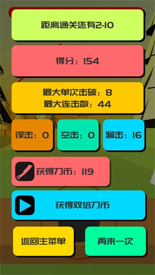 游戏里还会设置一些障碍,几个小圆球会混杂在木桩之间,砍刀碰到它们就会导致游戏结束,务必留意。