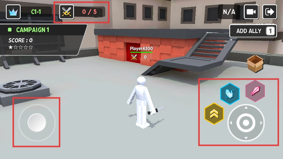 2、进入战斗后,利用左侧虚拟摇杆控制角色移动,右侧的功能按钮如攻击,完成上方的杀敌任务目标,如【0/5】的杀敌要求。