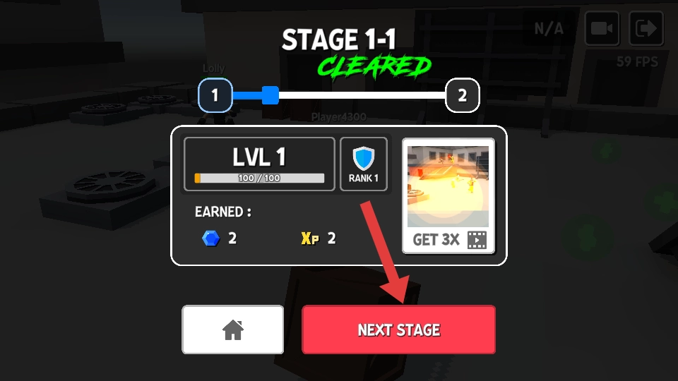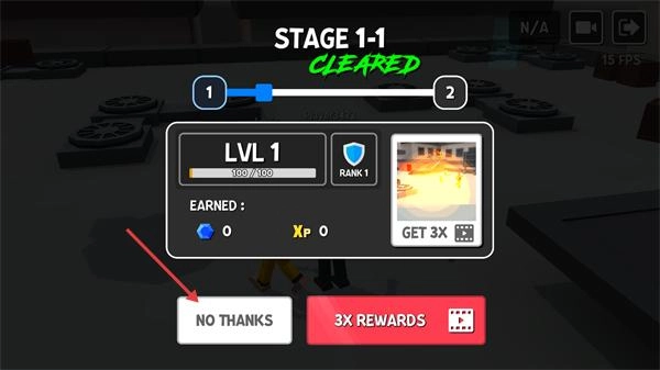 4、关卡通关后出现【STAGE-1-1-CLEARED】界面,点击【NO-THANKS】返回主界面,或选择【3X-REWARDS】获取额外奖励。
