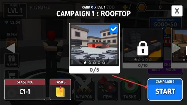 1、在【CAMPAIGN-1:ROOFTOP】界面点击【START】按钮,即可进入C1-1关卡,开启战役模式的挑战。