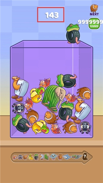 2、观察容器内角色,将上方新角色放入,尝试让相同角色靠近,为合并做准备。