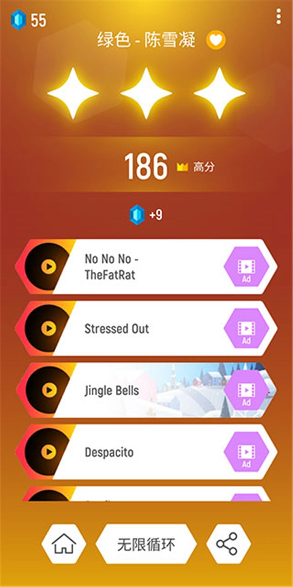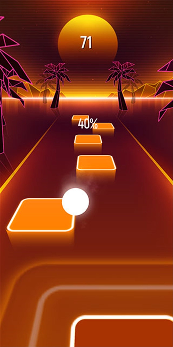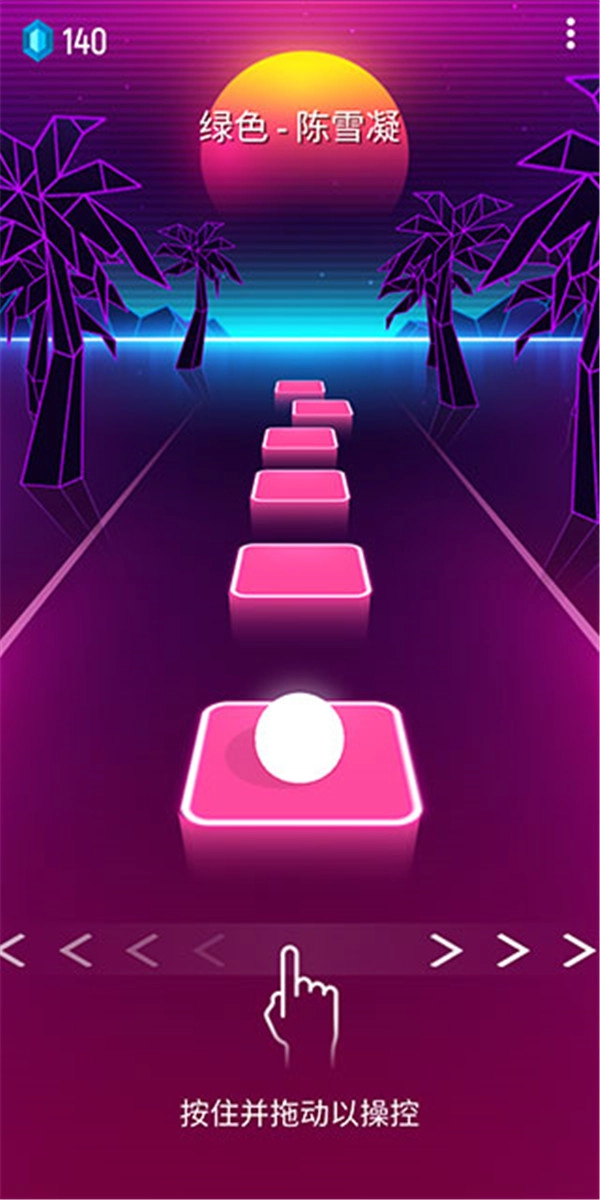 挑选你喜爱的歌曲开启挑战吧。按住屏幕,通过拖动来控制小球的运动路径。