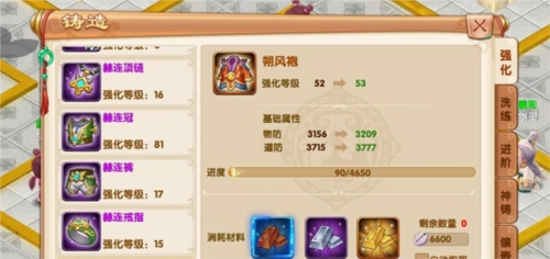 所有装备一开始都处于未强化状态,强化上限统一设定为100级,当装备强化到满级后就不能再进行强化操作了。强化装备时,需要用到强化材料和铜钱,消耗的多少和装备本身是什么部件、装备自身等级没有关系,只取决于当前的强化等级。每次强化都会用掉一个强化材料,铜钱的花费则会随着强化等级的提升而变化。强化只会对装备的基础属性产生影响,是按照百分比来增加属性的,而且当强化等级到20级和50级的时候,还会分别多开一个可以镶嵌宝石的孔。