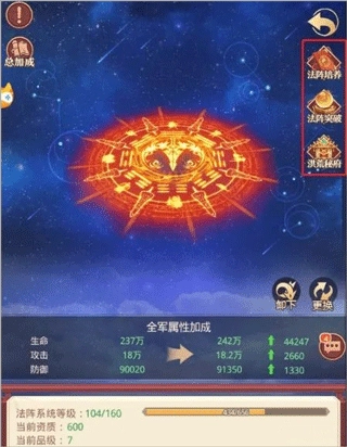 Q:法阵是游戏里与阵法相似的功能,玩家能够借助其他玩法获取法阵碎片,进而合成法阵。法阵具备附加属性和自带的被动技能,还可以设置为战斗上阵状态,对战斗有着很大的助力。