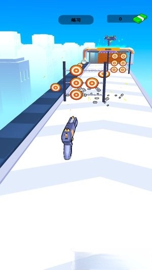 在这款游戏里,玩家会以第一人称的视角来操控一把自动枪械,顺着高空赛道持续向前行进。