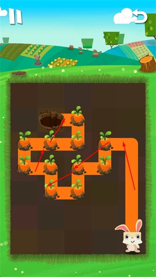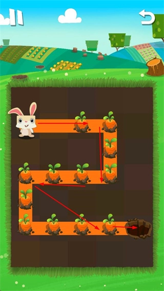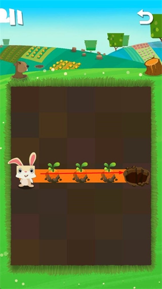 你需要操控兔子在地下规划行进路线,途中收集胡萝卜苗并促使它们成熟,最终引导兔子抵达洞穴。路线的设计形式多样,可以是直线、折线,也可以是复杂的迂回路线。