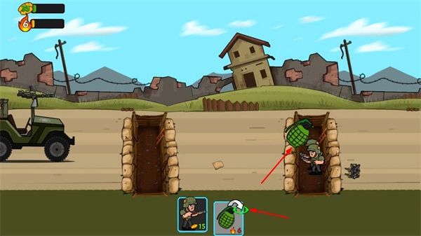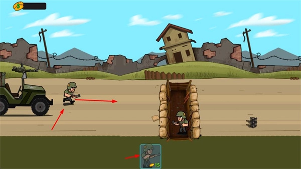 指挥士兵与载具的移动,将士兵部署至防御工事,界面会呈现士兵数量及资源状态。