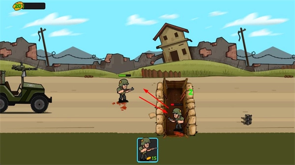 士兵在防御工事中能够对敌人进行射击,与敌方士兵展开交火,界面会呈现士兵的生命值和战斗状态,击败敌人可推动战斗进程。