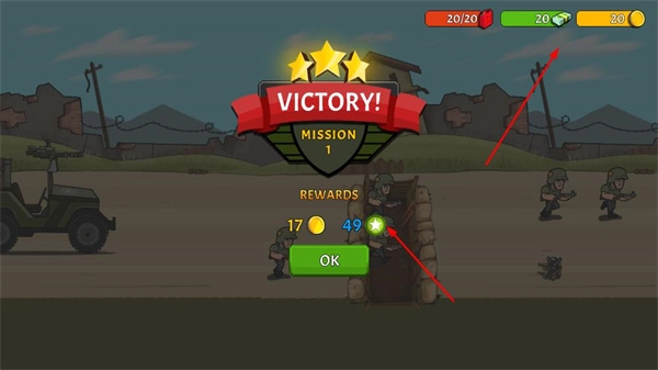 完成任务后,屏幕会出现VICTORY!的界面,上面会展示任务星级以及资源奖励,点击OK按钮就能领取这些奖励。