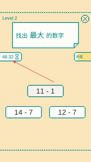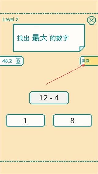 当碰到像12-4这类算式形式的数字时,要快速在心里算出结果,接着把它和其他数字进行比较,然后点击其中最大的那个数字,在此过程中还要注意进度条的变动情况。