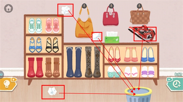 最后还剩下一双红色运动鞋,把它扔到垃圾桶里;再把各种废纸团也扔掉,最后用纸巾把靴子擦干净,这样就能通关成功了。
