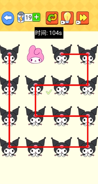第一关需避开粉色兔子,用一根线将所有酷洛米连接起来,按照图中的路线绘制即可。