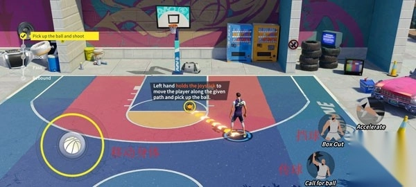 1、比赛界面内左下角可以移动角色,右下角有传球和投篮等动作。