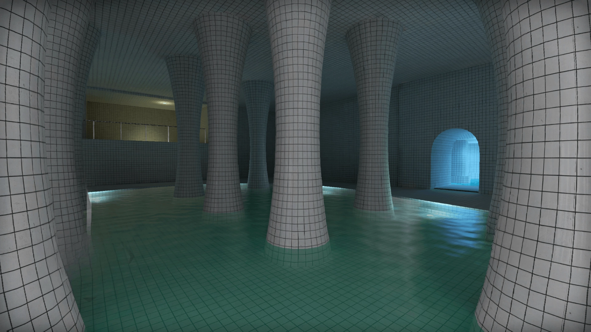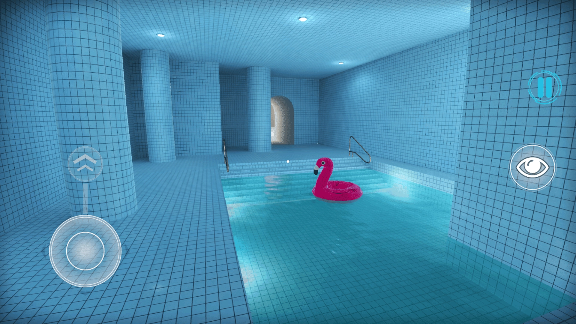 通过操控视角来环顾整个空间,移动到不同的区域,仔细查看泳池、支柱以及隐藏的角落,以此收集场景相关的信息。