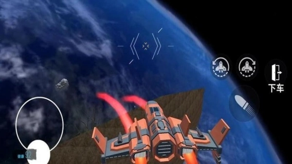 3、驾驶载具时,通过推进器维持飞行高度,利用太空场景里的陨石等障碍物来走位躲避,同时运用载具自带的攻击功能精准攻击远处目标,必要情况下点击“下车”按钮切换至地面作战。
