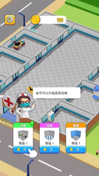 1、医院一开始只有基础医疗设备,玩家可以用治疗病人得到的金币来升级设备,设备的等级越高,诊疗的效率和病人的满意度提升效果就越显著。