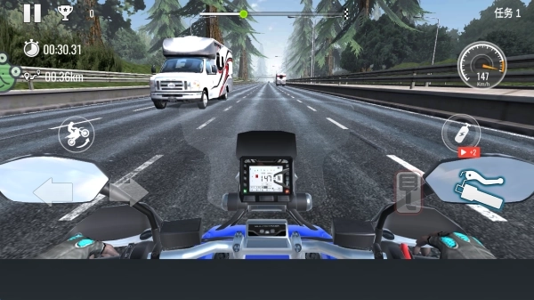1、点击屏幕下方的左右方向键,就能操控摩托车在多条车道间灵活切换,敏捷避开其他车辆,用最快速度到达终点。