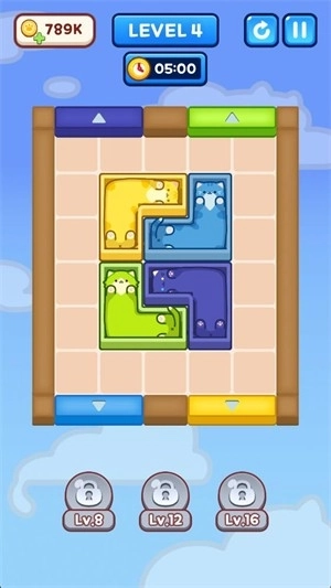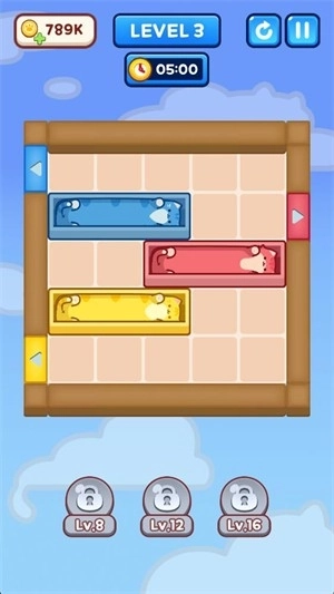 3、当方块移动到对应颜色的区域后,猫咪就能离开;等所有方块里的猫猫都成功逃脱,即可完成通关。