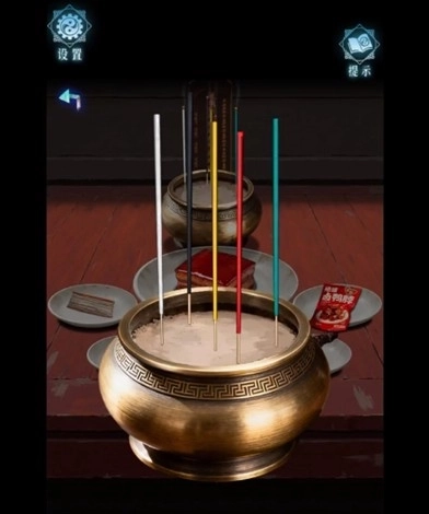 11、查看祠堂书架上的册子内容,得知五色香方位线索:青在东,红在索,黄在中,白在西,黑在北,根据香的位置线索,调整香炉中五色的位置为如图所示状态.