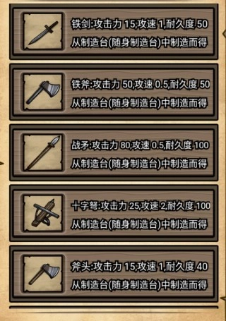 8、铁剑、铁斧、战矛、十字弩、斧头;