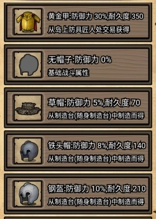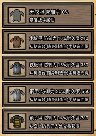 10、无衣服、木板甲、铁板甲、钢甲、锁子甲;
